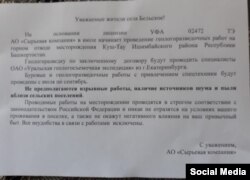 В минувшую субботу жители примыкающих к горе поселков обнаружили в почтовых ящиках объявление, в котором говорилось, что "АО Сырьевая компания на основании лицензии УФА 02472 ТЭ в июле начинает проведение геологоразведочных работ на горном отводе месторождения Куш-Тау". В объявлении указывалось, что буровые и геологоразведочные работы с привлечением спецтехники будут проведены с июля по сентябрь. При этом, подчеркивалось, что "не предполагаются взрывные работы, наличие источников шума и пыли вблизи сельских поселений". Жителей заверили, что работы "никак не отразятся на условиях их проживания в поселке, а также не окажут негативного влияния на привычный быт".