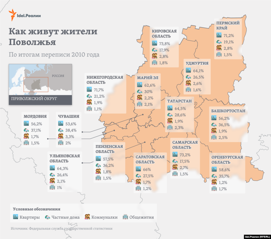 "Idel.Реалии" решили вспомнить результаты прошлой переписи. На этот раз посмотрим, где живет (жило в 2010 году) население регионов ПФО. У нас есть четыре варианта — квартиры, частные дома, коммуналки и общежития.