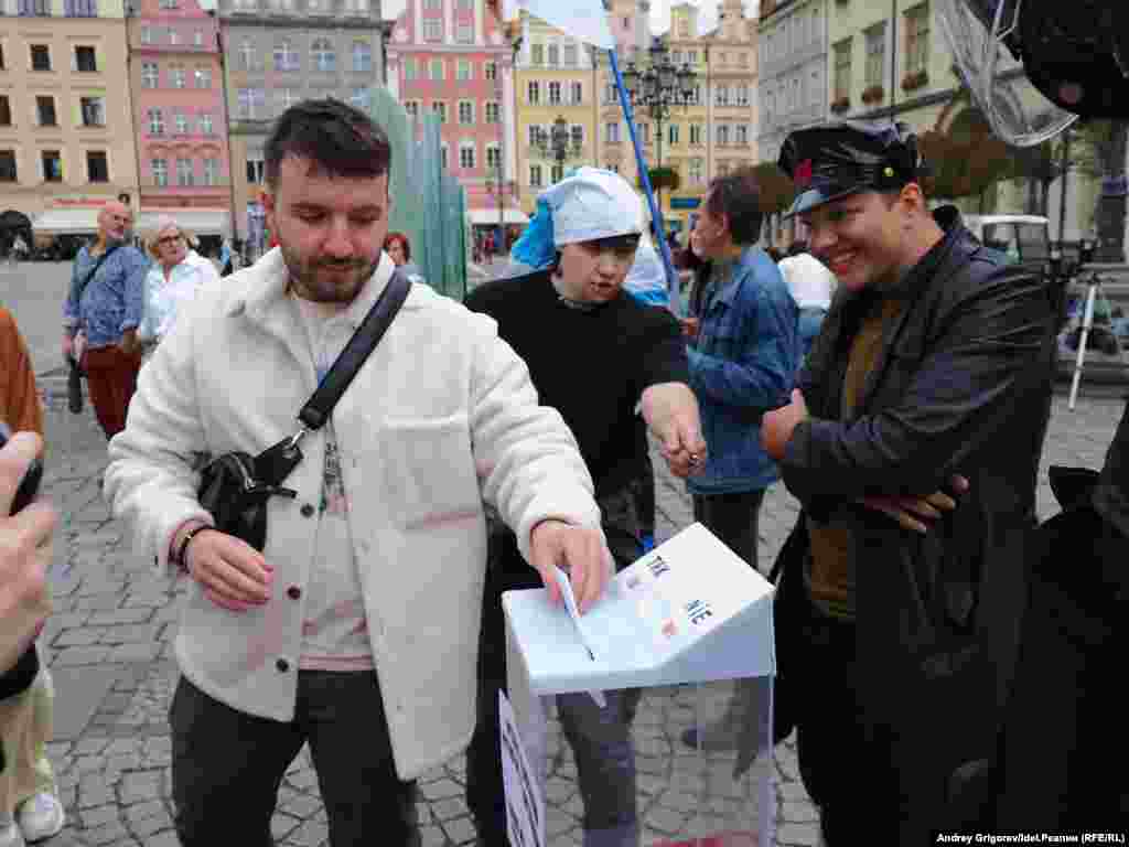 С начала нападения РФ на Украину россияне, живущие во Вроцлаве, проводят у городской ратуши театрализованные акции протеста. Очередная, в сентябре, была посвящена минувшим российским выборам. Участники постановки предлагали прохожим проголосовать.