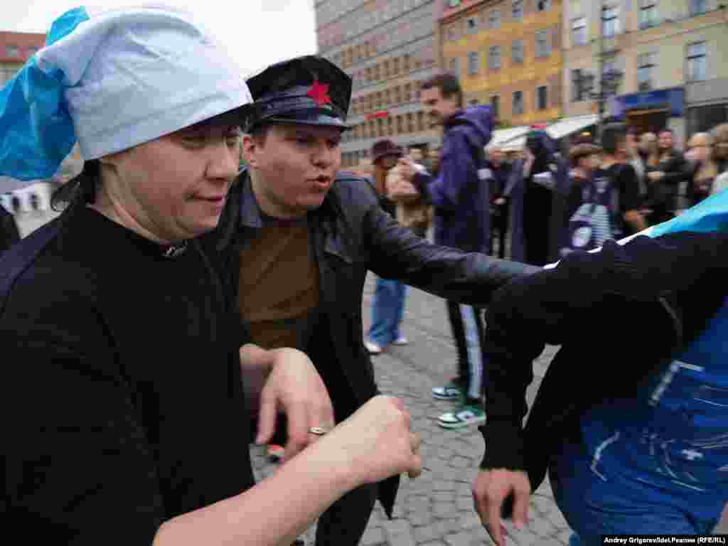 Завершилась постановка, впрочем, явно не в традициях путинской России: гномы при помощи молчаливых доселе участников пикета, стоявших по обе стороны урны с антипутинскими плакатами повергли обоих силовиков.