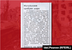 Этот заглавный материал называется "Горе не бывает суверенным". Митинг, о котором идет речь, был организован координационным советом татарского национально-демократического движения, созданным под эгидой мулюковского крыла ТОЦ. В тот день был сильный мороз, но на акцию пришли 700 человек.