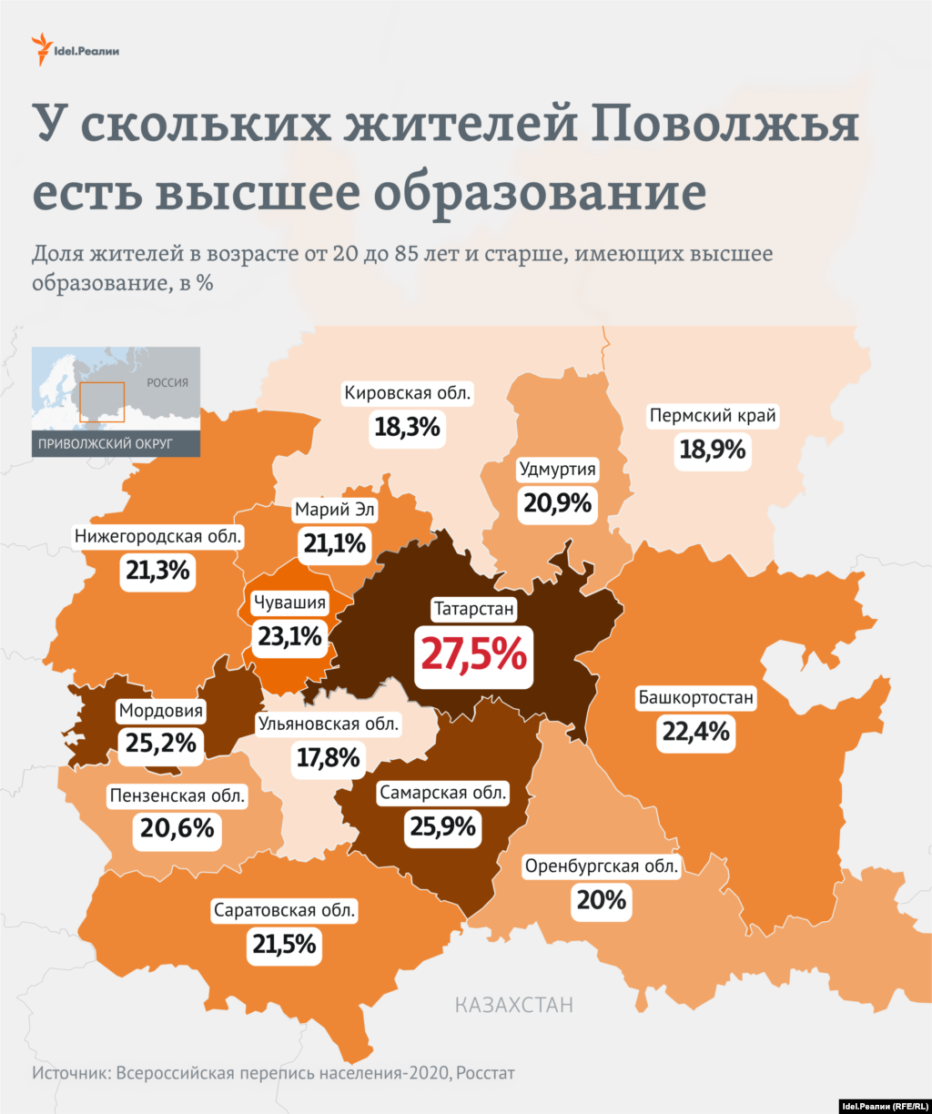 В рейтинге наиболее "образованных" регионов оказались Мордовия, Самарская область и Татарстан, где более 25%, жителей от 20 лет окончили вузы. На первом месте Татарстан с показателем 27,5%.