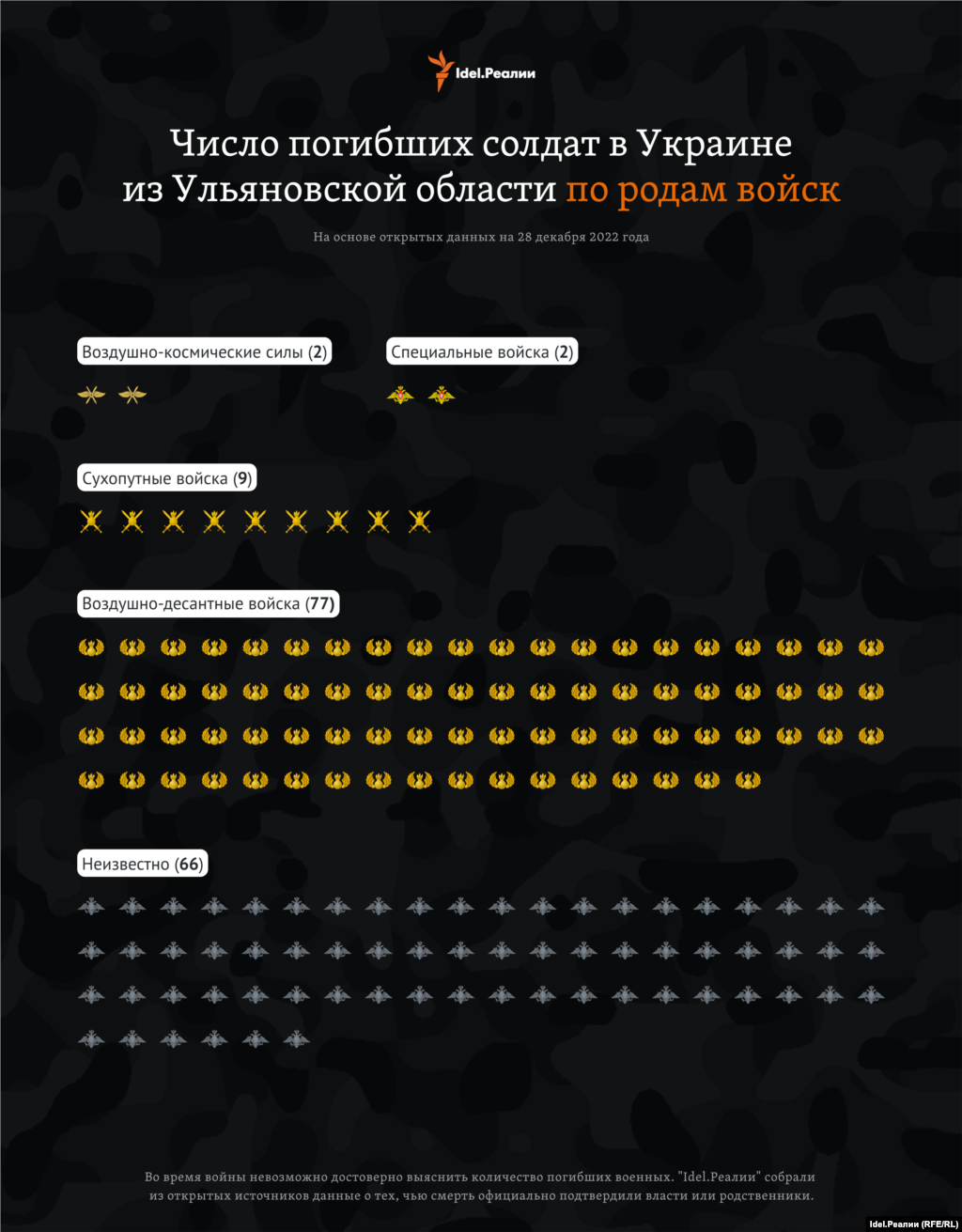 По официальным сведениям и источникам среди родственников погибших, в первые 10 месяцев войны в Украине погибли 156 человек из Ульяновской области. "Idel.Реалии" обнаружили десятки могил военных, о смерти которых не сообщалось до сих пор. Подробности читайте здесь.