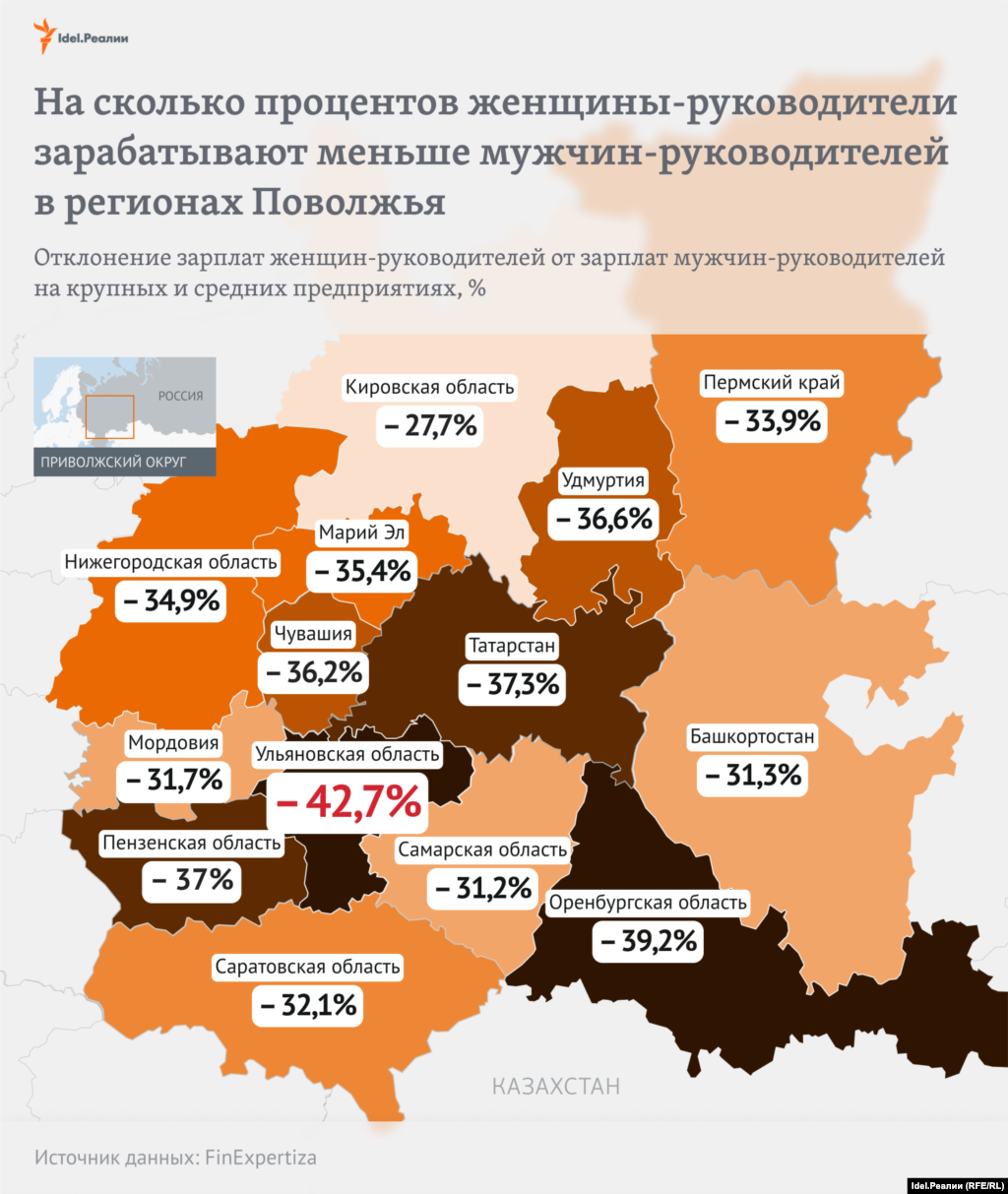 Зарплаты женщин-руководителей в Поволжье в среднем на 35% ниже мужских. Максимальные диспропорции отмечаются в Ульяновской области (зарплаты женщин-руководителей на 42,7% отстают от мужских), Оренбургской области (на 39,2%), Татарстане (на 37,3%).