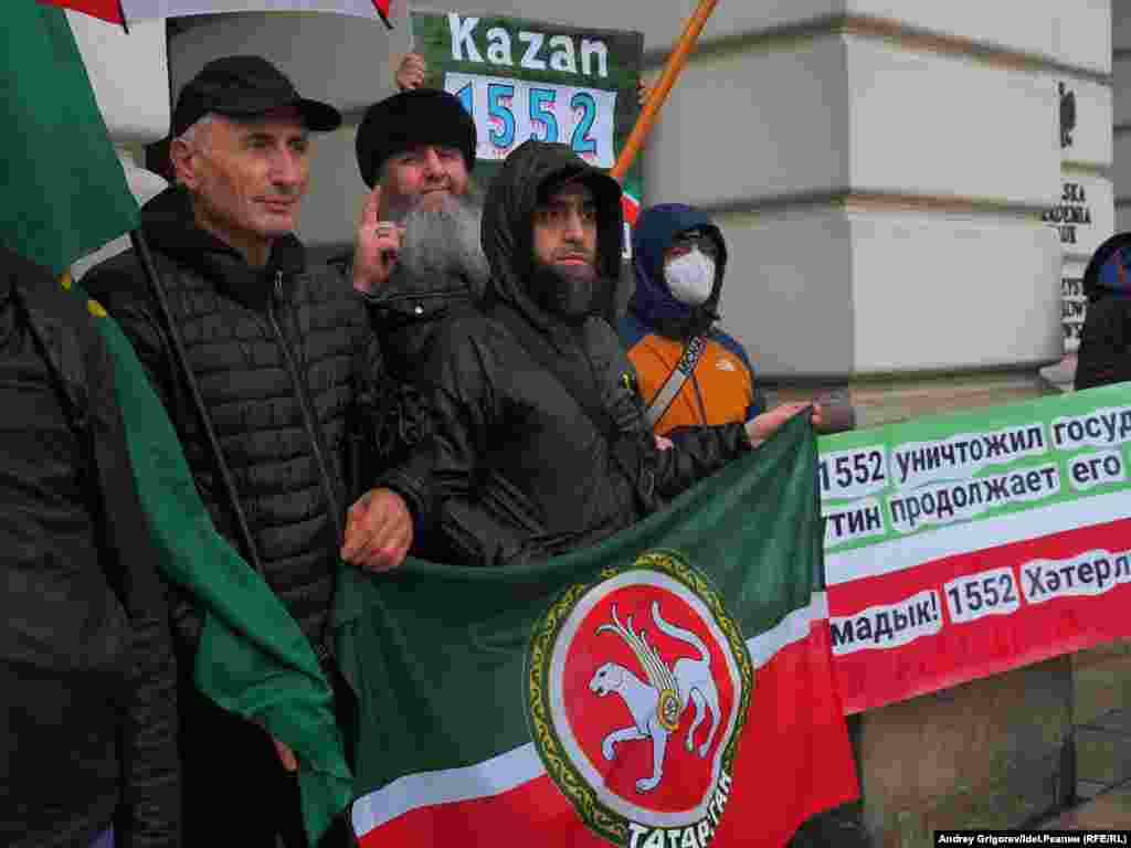Всего, несмотря на проливной дождь, собралось более тридцати человек, которым Нафис Кашапов раздал плакаты собственного изготовления. Надписи на плакатах были сделаны на разных языках — русском, татарском, украинском, белорусском, польском, английском.