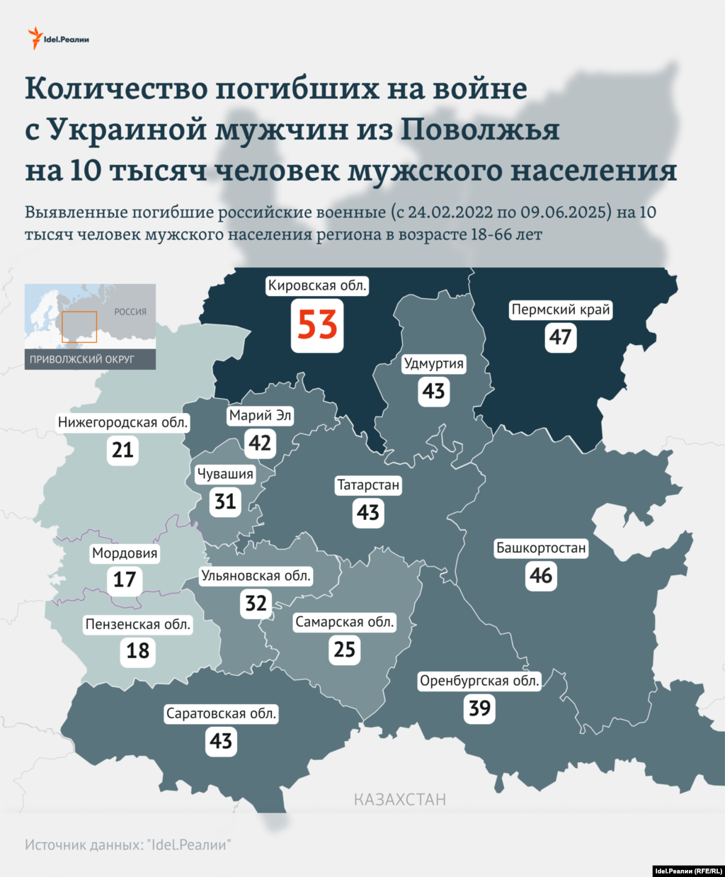 Кировская область стала лидером в Поволжье по количеству погибших военных на 10 тысяч мужского населения в возрасте от 18 до 66 лет. Об этом свидетельствуют расчеты "Idel.Реалии" на 9 июня 2025 года, основанные на данных из базы погибших уроженцев Поволжья с начала полномасштабного вторжения России в Украину.