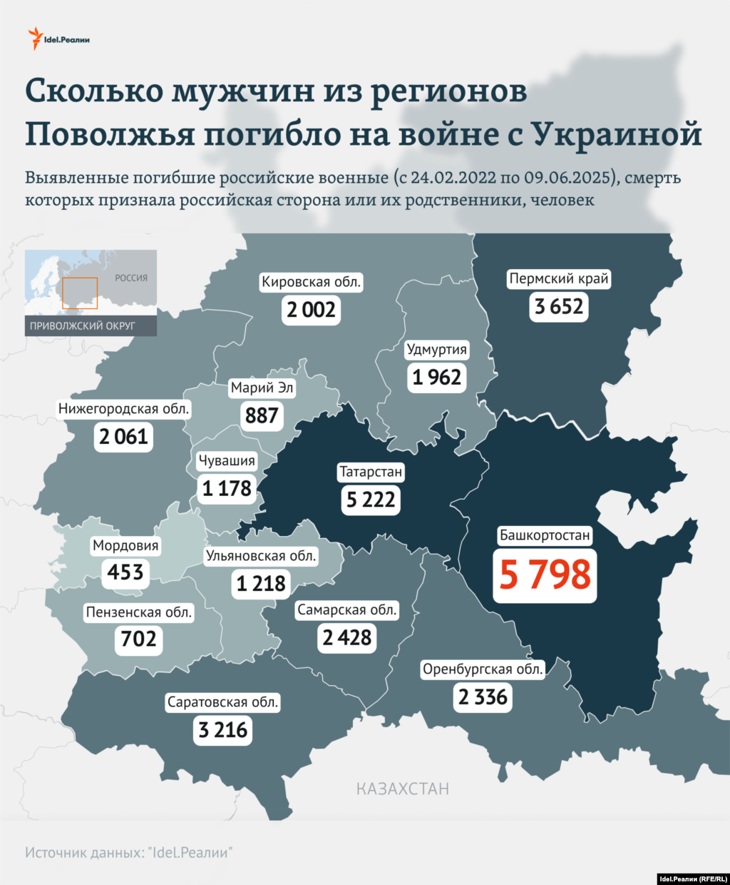 В абсолютных цифрах — не только в Поволжье, но и в целом по России — лидируют Башкортостан и Татарстан. В Башкортостане с начала полномасштабного вторжения погибли 5 798 человек, в Татарстане — 5 222. В Кировской же области в абсолютных цифрах погибли 2 002 человека.